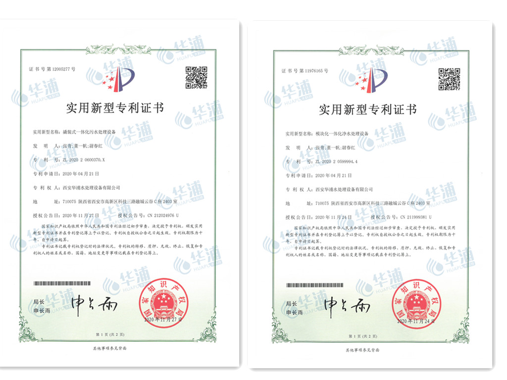 近日,華浦水科技自主研發(fā)的“撬裝式一體化凈水處理設(shè)備”和“模塊化一體化污水處理設(shè)備”兩項(xiàng)裝置獲得了國家知識產(chǎn)權(quán)實(shí)用新型專利。